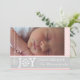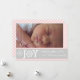 Modern pink, white stripes grey Christmas holiday elegant and stylish flat photo card featuring light pink and white stripes, a grey band with your text “Joy Peace and Love” with a snowflake in place of the letter "O" in the word joy, your names and two hanging white Christmas ornaments or balls .