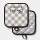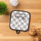 Pot holder featuring your name and the text "kitchen" below on a grey and white, plaid pattern background.