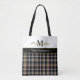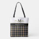The design features a modern tartan pattern and a white upper section with personalizable monogram and name . You can add your own text or phrase to this design. Elegant black and gold or olive green color scheme.