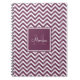 Personalised spiral notebook features a trendy plum chevron pattern with custom name in white handwriting font and monogram in lighter purple shade in matching plum frame.