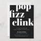 Modern and minimalist New Year's Eve party invitations feature chic black and white styling with "pop fizz clink" in oversized white retro lettering. Personalise with your New Years Eve celebration details beneath. Invitations reverse to a pattern of colourful stars in black on white.