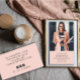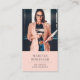 This business card features a photo layout with a framed title and name plate suitable for many professional titles like consultant, content developer, editor, sales consultant, etc. The reverse side features the contact info and business name. You can customise the text size, font, to fit your own personal style. Replace this sample place holder photo with your own portrait orientation business card. A peach pink background on the front and back of the card.