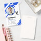 Create your own personalised employee name tags and badges using a vertical modern template that is easy to add your own photo, company logo, and other important information to. The sleek design on these professional name badges is geared towards managers, accountants, and other corporate staff, but the information and colours can be effortlessly changed to reflect your corporate brand or business. The background design element is an SVG graphic, allowing you to alter all 4 elegant wave colours in addition to the colour bars on the front and back side.