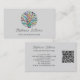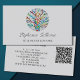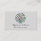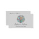 This modern business card is decorated with a colourful mosaic tree of life design and stylish script typography on a grey background.