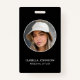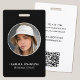 Impress with a stylish and professional identification badge. This double-sided template features your ID photo in a circle, and is personalised with a name, contact information, and a scannable QR code. Customise the text to match your brand. This modern design would suit many different workplaces and professions, including corporate professionals, retail salespersons, beauty consultants, hotel staff, small businesses, conference name tags and more! Printed colours: black and white.