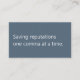 A modern, minimalist business card perfect for freelance proofreaders. The front features a dark blue grey background with the phrase "Saving reputations one comma at a time" in soft white text. The reverse has a soft white background with dark grey text and space for your contact details. All text on the card is fully editable.