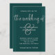This stunning wedding invitation features an emerald green background with lighter matching green borders, and modern silver handwritten script typography. A simple and contemporary look with an ampersand flourish and bold matching text.
