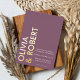 A simple modern wedding invitation featuring bold typography gold foil names, purple colour and minimalist design.