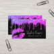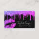 This gorgeous makeup artist business card design features faux purple glitter lips & dripping glitter, black background and elegant calligraphy font.