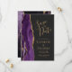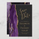 The left-hand edge of this elegant modern wedding save the date card features a purple watercolor agate border trimmed with faux gold glitter. The customisable text combines gold-coloured handwriting, copperplate and italic fonts on a slate black background. The reverse side features a matching purple and gold agate design.