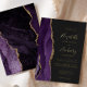The left-hand edge of this elegant modern wedding invitation features a purple watercolor agate border trimmed with faux gold glitter. The customisable text combines handwriting, copperplate and italic fonts in real gold foil on an off-black background. The reverse side features a matching purple and gold agate design.