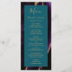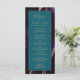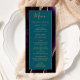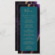 This elegant, modern wedding menu features a watercolor purple agate background trimmed with gold faux glitter. The text appears in elegant gold coloured handwriting and copperplate fonts on a teal blue rectangle. The agate design is repeated on the reverse.