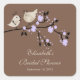Cute love birds Bridal Shower square sticker featuring bride & groom birds sitting on a branch with lavender lilac flowers set on a chocolate brown background. Great for bridal shower favour tags & envelope seals! Customise with your bridal shower information and you're all set to go! Matching invitations and postage stamps available in our shop www.celebrateitinvites.com.