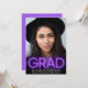 Fun and trendy graduation announcement with "GRAD" in bright purple neon typography overlaying your graduate's photo. Personalise with her name, class year and school.