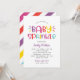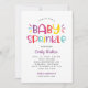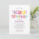 This fun and colourful baby sprinkle invitation features bold "Baby Sprinkle" lettering in a playful rainbow palette of hot pink, violet purple, aqua blue, orange red, and bright yellow on a crisp white background. Diagonal rainbow cabana stripes add a festive, eye-catching finishing touch on the back. All wording is fully customisable for your sprinkle celebration. A perfect choice for a vibrant, modern baby girl sprinkle party.