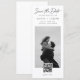 Send a modern save the date with a clean, simple design. The tall bookmark layout includes a calligraphy header, a black and white photo, and a QR code that takes guests to your wedding website. Add your names, date, and link for an easy and stylish way to introduce your celebration.