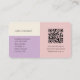 Modern and chic QR code & social media business contact card. This card features a combination of contemporary fonts, a QR code, website, contact details and social media link. The tri-colour backgrounds include lilac, light cream and peachy pink.
