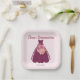 Modern Quinceañera paper party plate features floral and glitter ballgown on pale pink background.