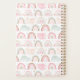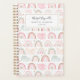 Whimsical rainbow theme planner for women features modern illustration of rainbow with clouds and raindrops in pastel colours.