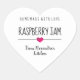 Modern "homemade with love" sticker featuring "raspberry jam" with a black font on a white background embellished by a cute heart. Customise text.