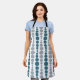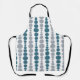 This apron has a mid-century modern design of teal and gray rounded rectangles in increasing and decreasing size running vertically on a field of white.