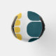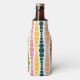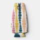 This bottle cooler has a mid-century modern design of vertical lines of rounded rectangles in increasing and decreasing size in retro colors of red, green, blue, yellow, orange, and brown on a field of white.