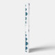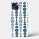 This phone case has a mid-century modern design of teal and grey rounded rectangles in increasing and decreasing size running vertically on a field of white.