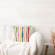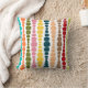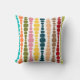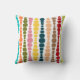 This throw pillow has a mid-century modern design of vertical lines of rounded rectangles in increasing and decreasing size in retro colours of red, green, blue, yellow, orange, and brown on a field of white.