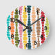 This wall clock has a mid-century modern design of vertical lines of rounded rectangles in increasing and decreasing size in retro colors of red, green, blue, yellow, orange, and brown on a field of white.