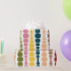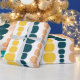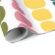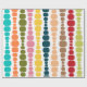 This wrapping paper has a mid-century modern design of vertical lines of rounded rectangles in increasing and decreasing size in retro colours of red, green, blue, yellow, orange, and brown on a field of white.