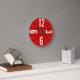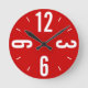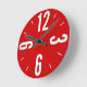 Modern red and white large numbers Round Clock. It showcases the numbers 3, 6. 9 and 12 in white in large size and white lines instead of the rest numbers on red.