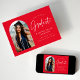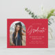 Trendy graduation announcement featuring the graduate's photo framed by a red arch with "Graduate" in a white handwritten script. Personalise the front of the arch graduation announcement card by adding the graduate's name, graduation year, school name, and future plans. The photo graduation announcement reverses to display a red and white dotted pattern. The announcement is suitable for both high school and college graduates.