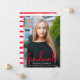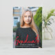 Stylish, modern graduation announcement featuring the graduate's vertical photo with "Graduate" in a red brush script font. Personalise the photo graduation announcement by adding the graduate's name, school name, and graduation year. The trendy graduation announcement reverses to display a red and white striped pattern.