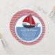 A modern first birthday party invitation with a sailing nautical theme. This invitation features a circular design with a yacht sailing through the water in shades of red, blue and white. The text is fully customisable for your own special occasion - even the number on the sail can be changed to reflect the age of the birthday boy or birthday girl.