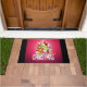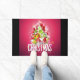 Doormat with a bright and festive Christmas graphic design. The text says Merry Christmas & Happy New Year. Designed with a tree shaped mound of presents with festive snowflakes, stars, christmas baubles and glowy looking sparkles. Pine tree needles and tree shaped illustration also included in this holiday image. The background is a vibrant reddish pink colour.