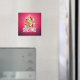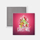 A magnet with a bright and festive Christmas graphic design. The text says Merry Christmas & Happy New Year. Designed with a tree shaped mound of presents with festive snowflakes, stars, christmas baubles and glowy looking sparkles. Pine tree needles and tree shaped illustration also included in this holiday image. The background is a vibrant reddish pink colour.