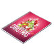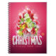 A notebook with a bright and festive Christmas graphic design. The text says Merry Christmas & Happy New Year. Designed with a tree shaped mound of presents with festive snowflakes, stars, christmas baubles and glowy looking sparkles. Pine tree needles and tree shaped illustration also included in this holiday image. The background is a vibrant reddish pink colour.