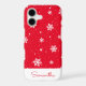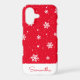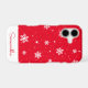 This cute Christmas iPhone 12 case features a trendy winter pattern with white stars and snowflakes on a red background. Personalise it with a name in the matching handwriting font.