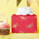 This wrapping paper features modern faux gold foil dragonfly pattern on red background.