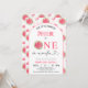 Sweet watermelon or melon theme first birthday invitation for baby girl featuring a round watermelon slice, white arch, modern calligraphy text with a heart and a watermelon pattern. This one in a melon first birthday invitation is ideal for someone looking for a modern summer or melon themed first birthday invitation.