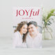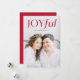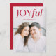 Simple holiday photo card "Joyful" displayed in red modern lettering. Personalise the modern holiday card by adding your vertical photo, family name, and the year. The card reverses to display subtle white dots on a red background.