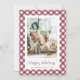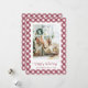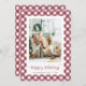 Custom red plaid photo holiday card featuring a red and white chequered pattern and a modern script font. Easily personalise this gingham check photo holiday card with your photo and the family name.