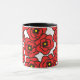 This custom coffee mug features a modern pattern of bold red poppy blooms with yellow and black centres on a white background.
