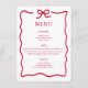 Clean, modern, and effortlessly stylish, this Quinceañera menu features bold red typography, a plain white background and a hand-drawn bow and border for a trendy coquette look. It’s perfect for a fashion-forward guest of honour who values simplicity.