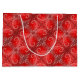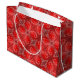Stylish and festive red holiday large gift bag. Colourful pattern of swirling snowflakes and sparkling accents on a red background.
