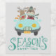 Whimsical modern holiday design features reindeer and bear driving in convertible car with Season's Greetings aqua hand drawn text.