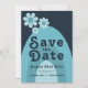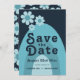 Modern retro rainbow arch and simple daisy 60’s 70’s style wedding save the date invitation. A vintage groovy hippy style colour theme with navy blue, dusty blue, blush blue and pastel blue. Beautiful minimalist daisy pattern on the back of the invitation and three simplistic daisies with an arch and groovy 70s style typography. Original artwork by artist Catherine Sweetman