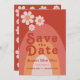 Bold modern groovy retro 70s orange wedding save the date invitation. Cool retro minimalist daisy pattern with rainbow arch design in apricot terracotta orange and peach. This fun hippy save the date card is easy to personalise using the simple templates. Ideal for setting the tone for a summer spring or autumn wedding. Original artwork by artist Catherine Sweetman