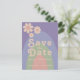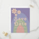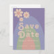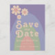 Bold modern groovy retro 70s pastel colours wedding save the date invitation. Cool retro minimalist daisy pattern with rainbow arch design in blue peach pink green and liliac lavender purple. This fun hippy save the date card is easy to personalise using the simple templates. Ideal for setting the tone for a summer spring or autumn wedding. Original artwork by artist Catherine Sweetman