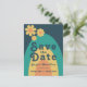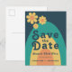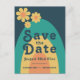 Bold modern groovy retro 70s vintage colours wedding save the date budget postcard invitation. Cool retro minimalist daisy pattern with rainbow arch design in navy blue mustard yellow orange peach and teal green. This fun hippy save the date card is easy to personalise using the simple templates. Ideal for setting the tone for a summer spring or autumn wedding. Original artwork by artist Catherine Sweetman